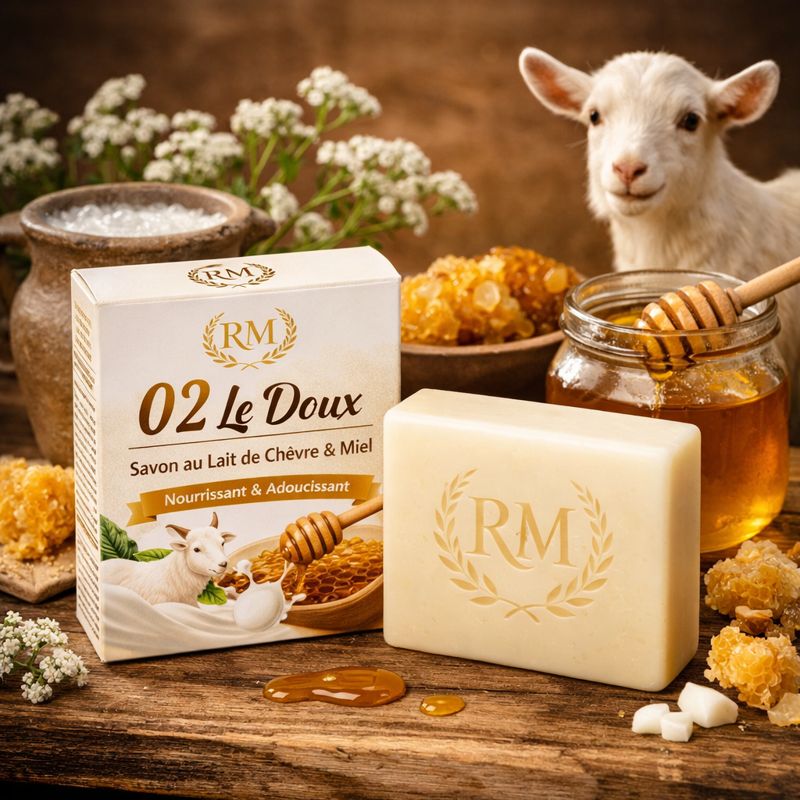 Le savon RM 02 – Le Doux associe les bienfaits reconnus du lait de chèvre et du miel naturel pour offrir un soin complet, doux et nourrissant à la peau.